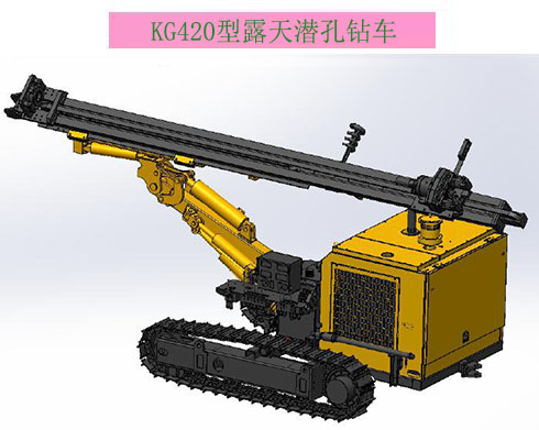 KG420/KG420H型露天潜孔钻车是在KG930B钻车基础上进行升级改进的一款设备。配备有玉柴四缸国三发动机。采用折边履带架和工程四轮一带,履带调平,柱塞行走马达,提高工作压力, 增加其爬坡性能。增大俯仰和举臂油缸,满足其极限位置使用要求。回转采用双马达减速器回转, 增大回转扭矩和转速。加大提升油缸缸径和活塞杆径以及链条,提高提升力和可靠性。罩壳采用 加厚型材折边,增加其强度和刚性。增加起吊吊环,方便装卸吊装。KG420/KG420H型露天潜孔钻车技术参数